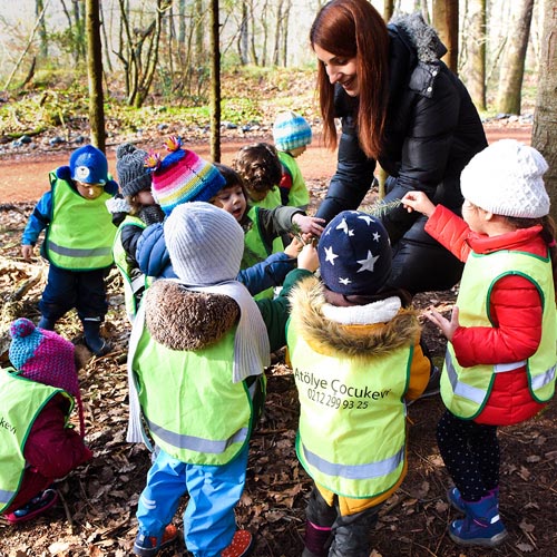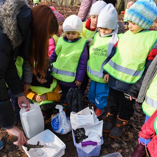 Etrafta köpeklerin ayak izi çoğunluktaydı en uygun olanının etrafını alçının akmaması için mukavva ile çevirdik önce, sonra da çabuk kuruyan alçıyı sulandırıp ayak izinin üstüne döktük ve kurumasını bekledik. Bu arada hem ormanda yürüyüş yaptık hem de ormanın içinde ki oyun alanında oynadık. Alçının kurumasıyla da ayak izimizi alıp okula geri döndük.