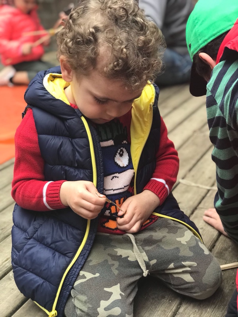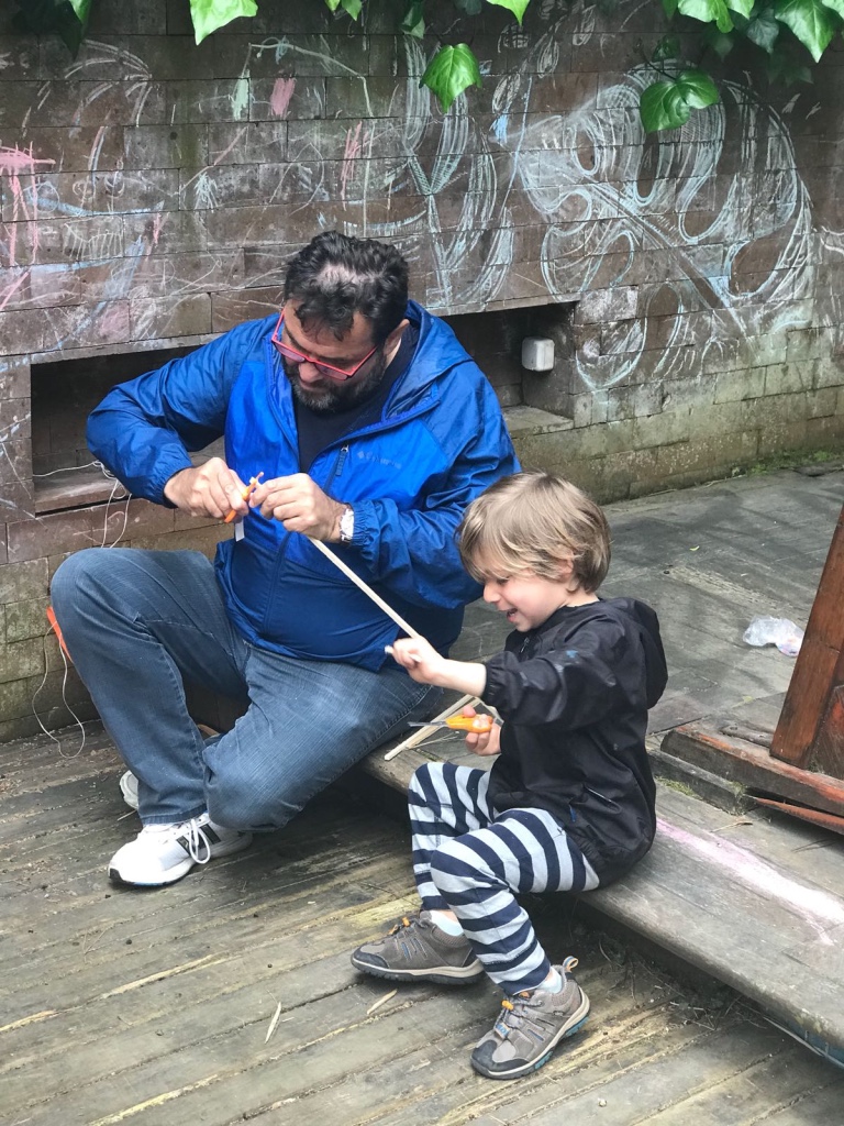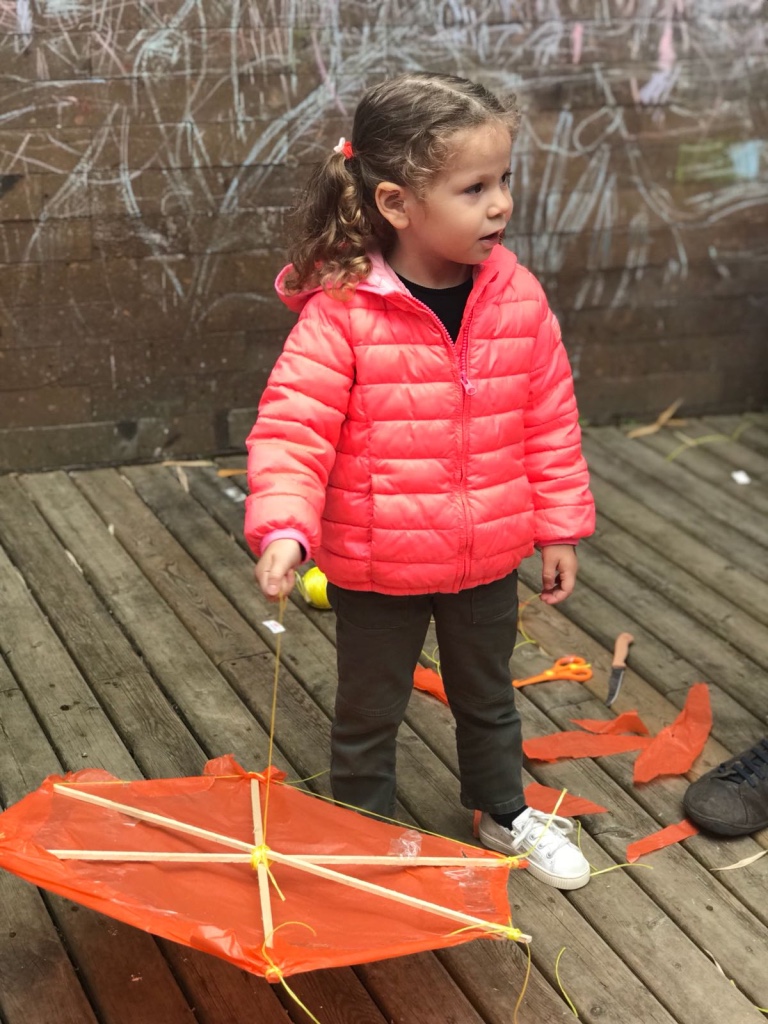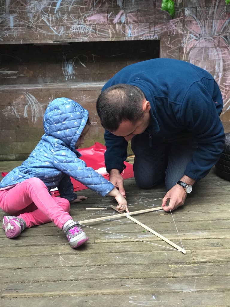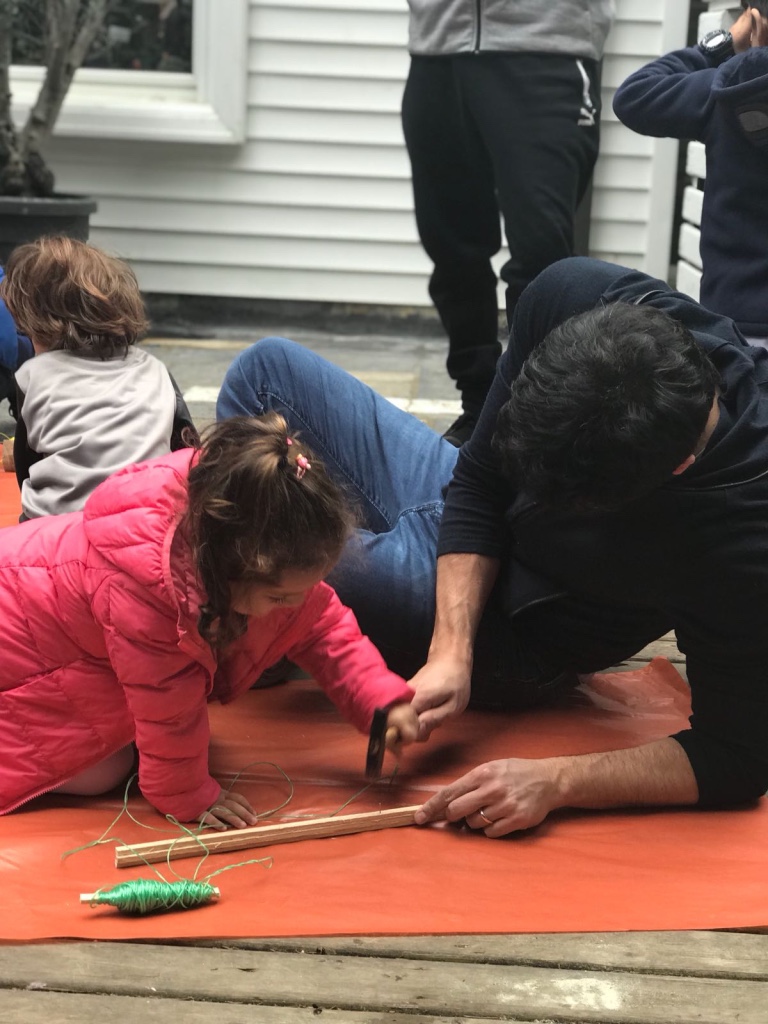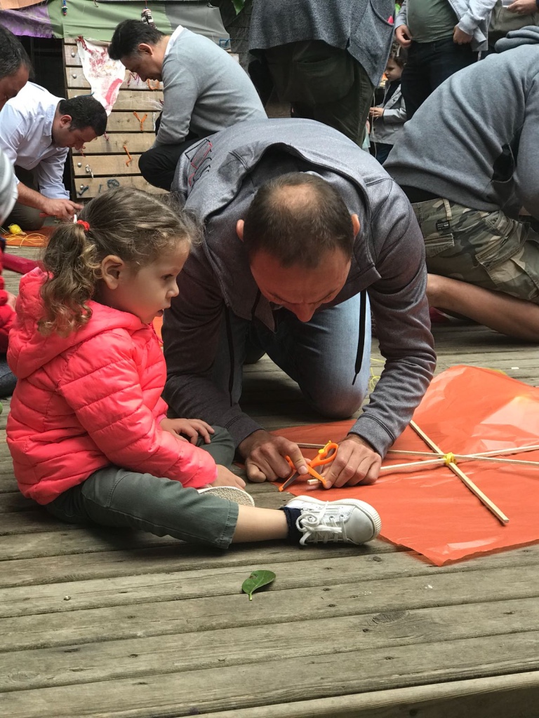 Ardından malzemelerini alan başladı çalışmaya. İlk iş olarak çıtaları birbirine sabitledik, çivi ile yapılan bu işlemde babasına yardım eden çocuklarımızın çekiç becerileri tüm babalarımızı şaşırttı. Çivi ile sabitleme sonrası iplerle birbirine tutturma işlemine başlandı. İplere dolanan ve yumaklarla oynayan çocuklar ile ortalık iyice hareketlenmeye başladı. Uçurtmanın iskeleti oluştuktan sonra sıra kağıdını yapıştırmak ve süslemeye gelmişti. Renk cümbüşüne dönen arka bahçemizde kağıtlarla oyunlar başladı bu sefer de çocuklarımız için. Biraz yardım biraz oyun ile günlerini eğlenceye döndüren çocuklarının birbirleriyle olan arkadaşlıklarını gözlemleyen ve mutlu olan gülen babaların gözlerini izlemek ise bizler için hayranlık vericiydi.